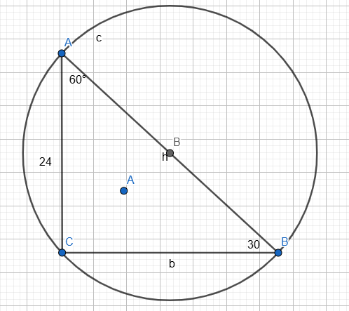 5)ABC եռանկյանը արտագծված է շրջանագիծ։ Գտեք այդ շրջանագծի շառավիղը, եթե AC=24սմ, <A=600, <B=300 ։