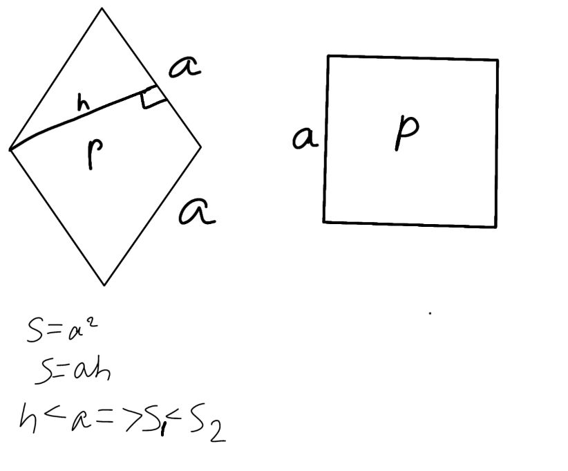 3)Քառակուսին և քառակուսի չհանդիսացող շեղանկյունն ունեն հավասար պարագծեր։ Համեմատեք այդ պատկերների մակերեսները։