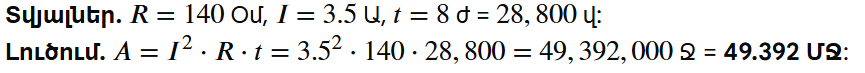 1. Բնակարանի տաքացման համար օգտագործվող 140 Օմ դիմադրություն ունեցող էլեկտրական ջերմատաքացուցիչը նախատեսված է 3.5 Ա հոսանքի ուժի համար: Որքա՞ն էներգիա կծախսի այդ ջերմատաքացուցիչը 8 ժամ անընդհատ աշխատելու դեպքում: