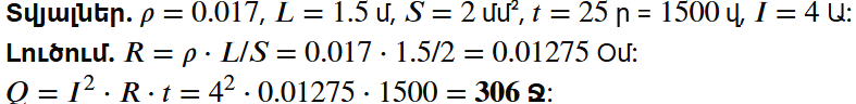 10. Էլեկտրական ջեռուցչի0.017 Օմ⋅մմ2 /մ տեսակարար դիմադրությամբ պղնձե սնուցող հաղորդալարի երկարությունը 1.5 մ է, լայնական հատույթի մակերեսը՝ 2 մմ2 : Որքա՞ն ջերմաքանակ կանջատվի այդ հաղորդալարում 25 րոպեի ընթացքում, եթե շղթայում հոսանքի ուժը 4 Ա է: