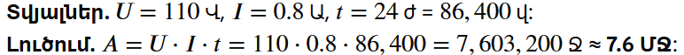2. Ավտոտնակում էլեկտրական լամպը մոռացել էին անջատել: Որքա՞ն աշխատանք էր իզուր կատարվել 24 ժամում, եթե լամպը միացված էր 110 Վ լարման ցանցին և նրանով անցնող հոսանքի ուժը 0.8 Ա էր: