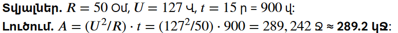 3. 50 Օմ դիմադրություն ունեցող էլեկտրական վարսահարդարիչը միացրեցին 127 Վ լարման ցանցին: Որքա՞ն աշխատանք կկատարի նրանում հոսանքը 15 րոպեի ընթացքում: