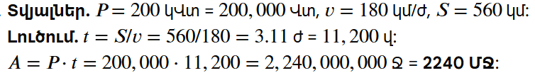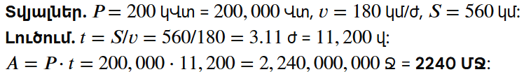 6. Ճեպընթաց էլեկտրագնացքը, որի շարժիչների ընդհանուր հզորությունը 200 կՎտ է, շարժվում է 180 կմ/ժ միջին արագությամբ: Որքա՞ն աշխատանք են կատարում նրա էլեկտրաշարժիչները 560 կմ ճանապարհ անցնելիս: