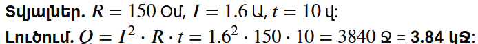 8. Հաղորդչի դիմադրությունը 150 Օմ է, նրանով անցնող հոսանքի ուժը՝ 1.6 Ա: Ի՞նչ ջերմաքանակ կանջատվի նրանում 10 վ-ի ընթացքում: