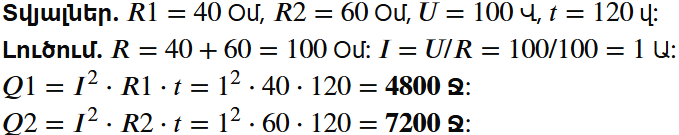 9. Շղթայի տեղամասում միմյանց հաջորդաբար միացված են R1=40 Օմ և R2 =60 Օմ դիմադրություններով ռեզիստորներ: Տեղամասի ծայրերում լարումը 100 Վ է: 2 րոպեի ընթացքում ի՞նչ ջերմաքանակ կանջատվի հաղորդիչներից յուրաքանչյուրում: Պատասխանը գրել ամբողջ թվի ճշտությամբ: