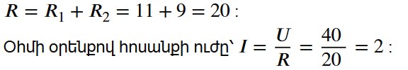 Խնդիր 3․Որքա՞ն է նկարում պատկերված շղթայի տեղամասով անցնող հոսանքի ուժը, եթե հաղորդիչներից առաջինի դիմադրությունը՝ R1= 11 Օմ է, երկրորդինը՝ R2= 9 Օմ: Լարումը տեղամասի ծայրերում՝ U= 40 Վ: