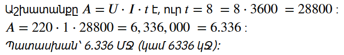 Խնդիր 5․Շքամուտքում էլեկտրական լամպը մոռացել էին անջատել: Որքա՞ն աշխատանք էր իզուր կատարվել 8 ժամում, եթե լամպը միացված էր 220 Վ լարման ցանցին և նրանով անցնող հոսանքի ուժը 1 Ա էր: